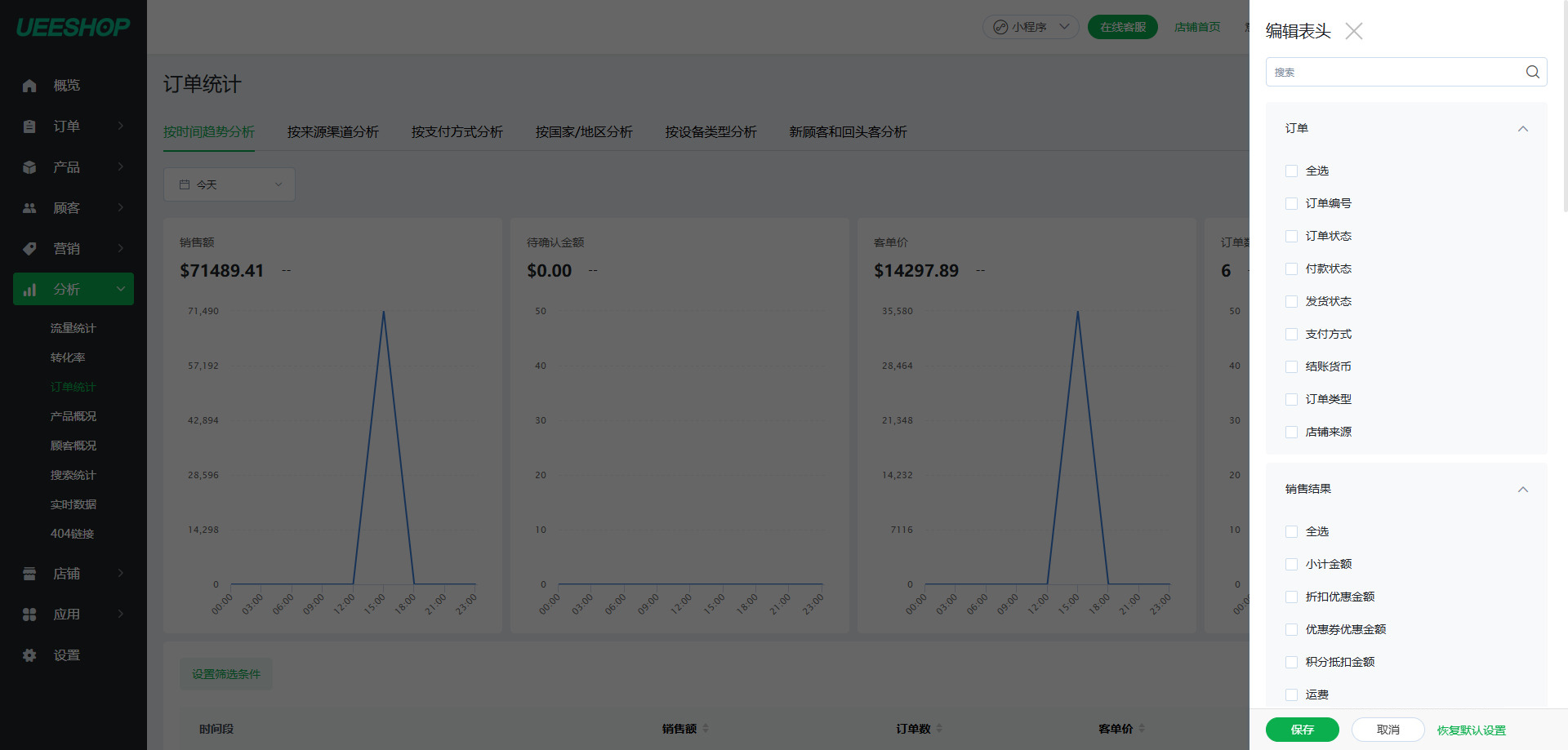 订单数据分析功能全面升级,支持按时间、渠道、支付时间、地区、设备类型及顾客类型分类分析,并支持组合筛选与字段自定义。
